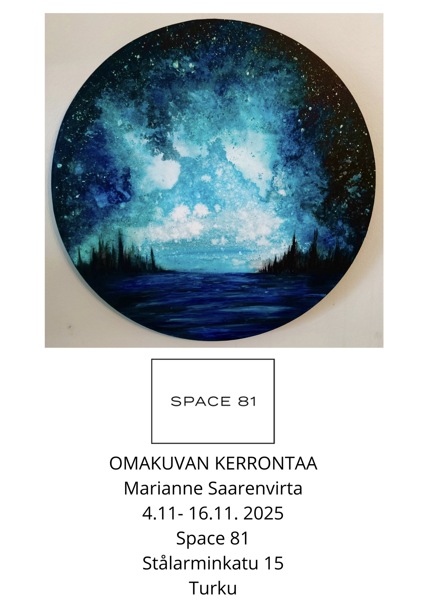 Työskentelen Space 81:ssa ja ympäristössä maanantaista perjantaihin. Olet tervetullut tapaamaan ja keskustelemaan kanssani arkiaamuisin ja iltapäivisin ti-to klo 9-10 ja 17-18. Perjantaina pyrin avaamaan näyttelyn työskentelyn tuloksista. Avajaiset toivottavasti perjantaina 21.11. klo 18 alkaen ja näyttely avoinna lauantaina ja sunnuntaina klo 12-16.