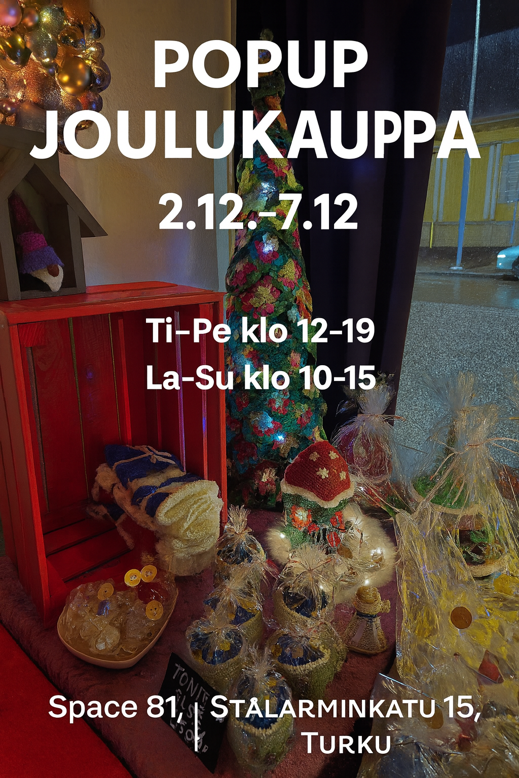 Täältä löydät kaiken omaan jouluun ja joululahjat. Myynnissä joulukoristeita,kransseja, joululeivonnaiset, mausteita ja leivontatuotteita, maustekahvit ja teet jouluun ja talveen,villasukkia ja muita lämpöä tuovia tuotteita.