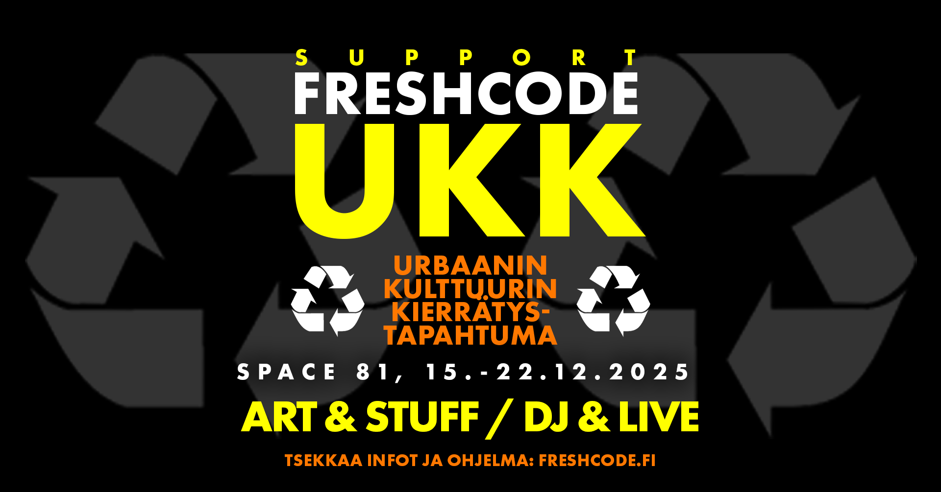 Järjestämme Freshcode UKK – Urbaanin Kulttuurin Kierrätystapahtuman taidenäyttelyineen ja taide-esityksineen kulttuuri- ja näyttelytila Space 81:ssa joulun alla 15.-22.12. Tarkista päivittyvä ohjelma Freshcoden sivulta ja seuraa Freshcoden some-kanavia Instagramissa ja Facebookissa.